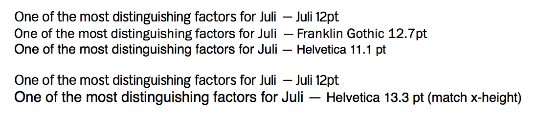 Setting countless Texts in it, Juli Book eventually settled to be significantly tighter than Helvetica when matching Cap Heights, and quite a bit fatter in its book weight than Franklin Gothic when set to take up the same amount of space.