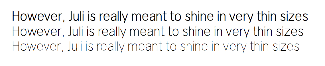 In fact, Juli comes in three different "thin" weights. Its large x- and overall height, its stocky, clear curves, and its tight spacing are designed to be of aid when reading text set in fashionably thin weights in which you normally wouldn't want to read copy in.